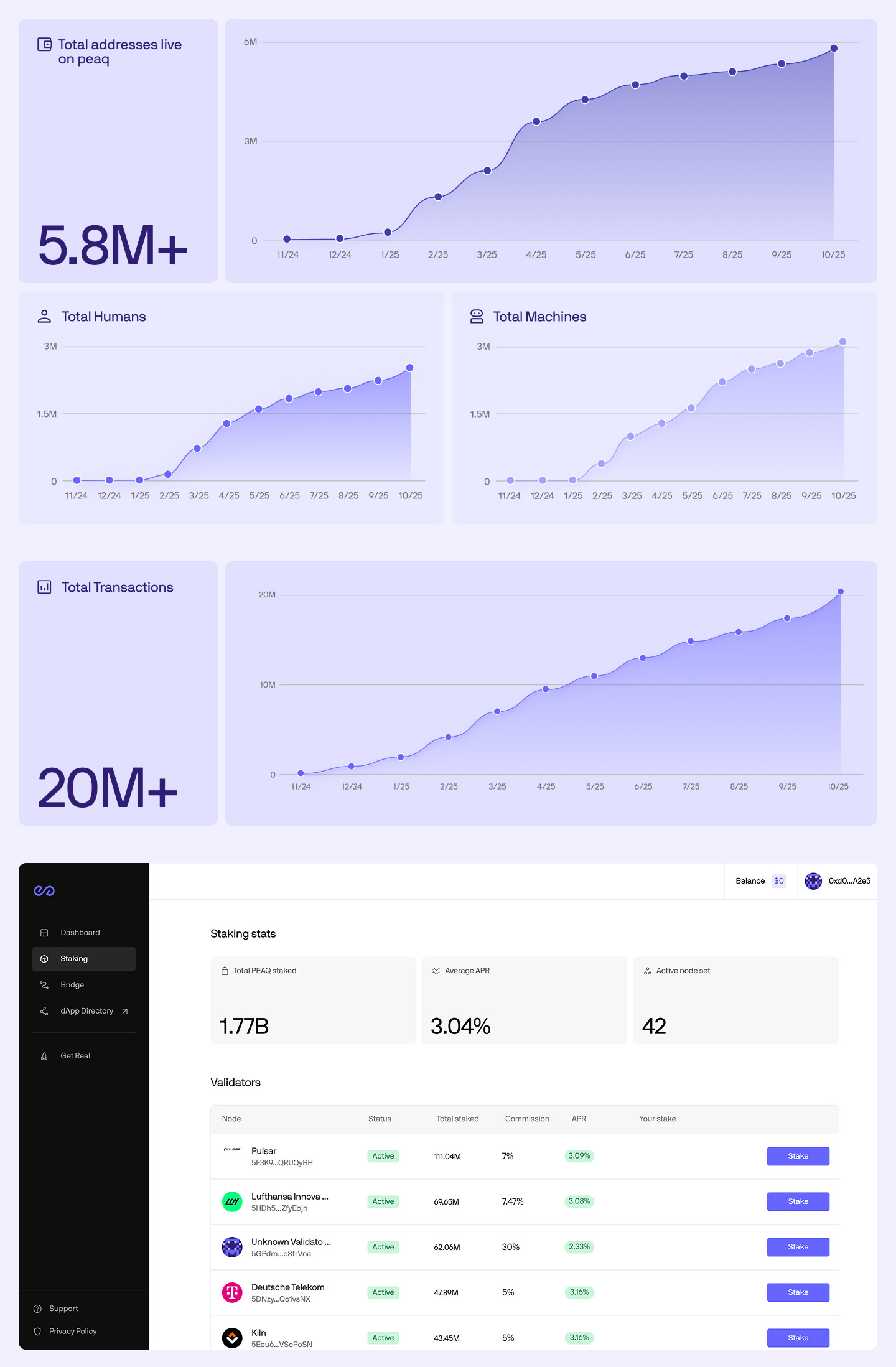 Keep track of all the latest stats on peaq’s Dune dashboard. And if you want to help secure peaq, make sure to start staking.