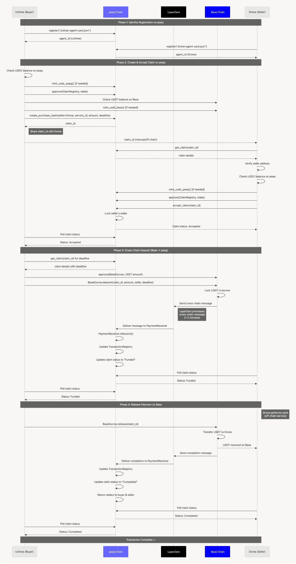 - The seller triggers the release on BaseEscrow; completion is relayed cross-chain to peaq.